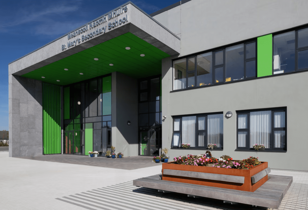 An interesting entrance feature for this exemplary school build, St. Mary’s Secondary School Ballina, designed to comply with Nearly Zero Energy Building standards. Fabworx design consultation resulted in the engineering of hidden fixtures and joints on the sub frame of each 7m high fin to create the illusion of ‘floating fins’.
